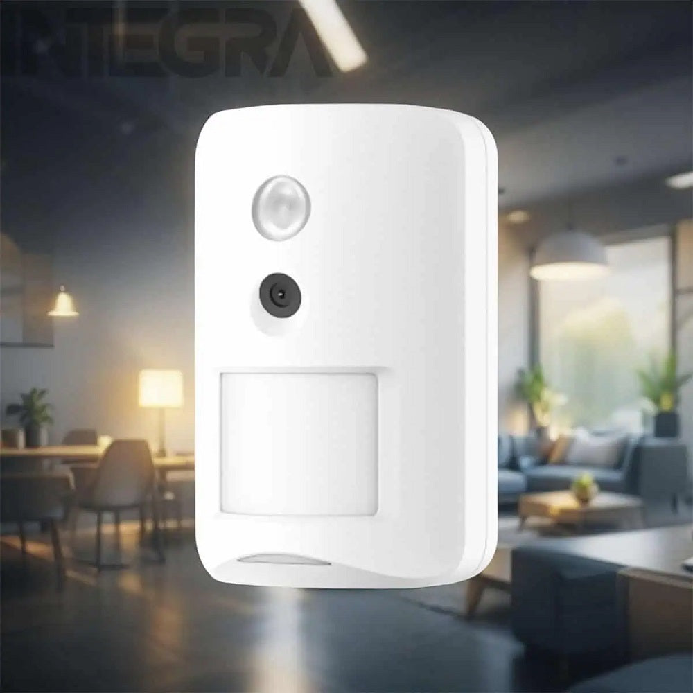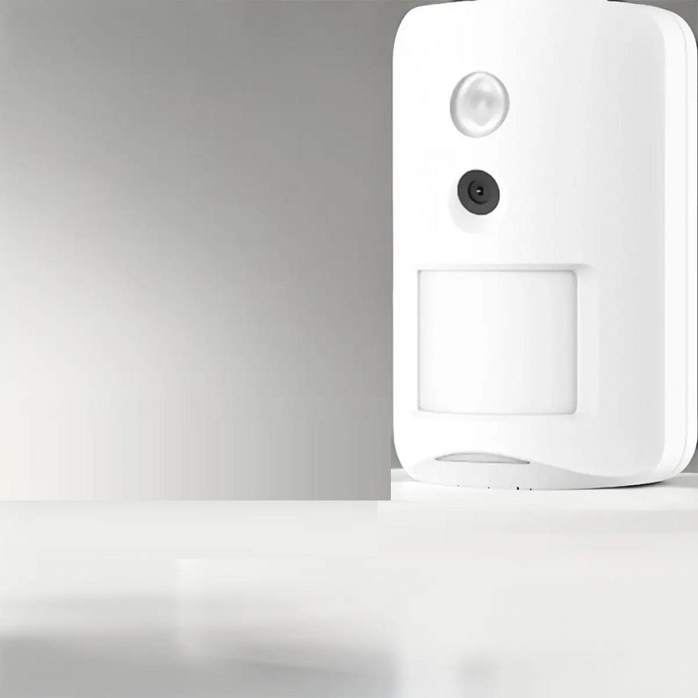 Detector PIR con cámara inalámbrico de la serie AXHOME, que ofrece detección en un rango de 10m y ángulo de 90°, inmunidad a mascotas de hasta 24kg, ajuste de sensibilidad (automático/alta/baja), y detección de movimiento en 78 zonas.