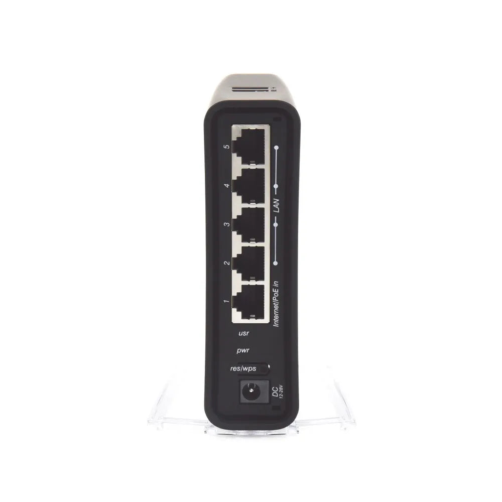 El hAP ac² es un punto de acceso dual concurrente que ofrece cobertura Wi-Fi en las frecuencias de 2,4 GHz y 5 GHz simultáneamente. Cinco puertos Ethernet 10/100/1000 ofrecen conexiones Gigabit para sus dispositivos con cable. El puerto USB permite almacenamiento externo o módem 4G/LTE, y es compatible con aceleración de hardware IPsec.
