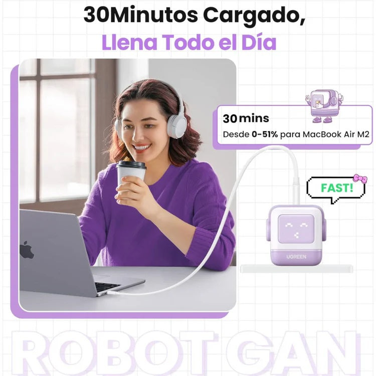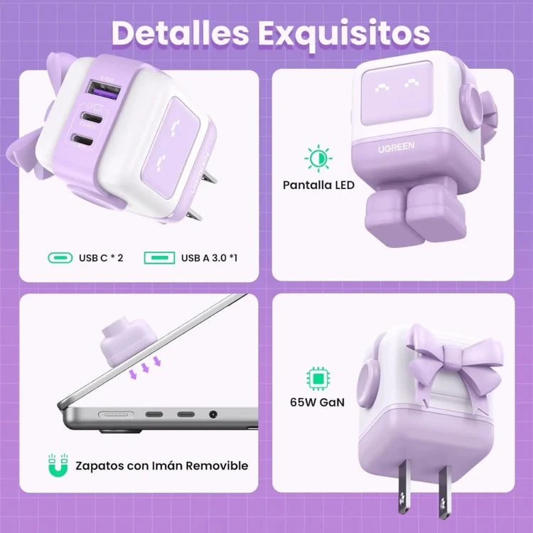 Cargador Tipo C USB-C UGREEN Robot 65W GAN , 2xUSB-C, 1xUSB-A, Nexode , Pantalla LED con 3 Puertos, Carga Rápida Compatible con MacBook Pro/Air M2, DELL XPS, iPad Pro, iPhone 15 14 Pro, Galaxy S24/S23 Ultra CD361 lila - 35314