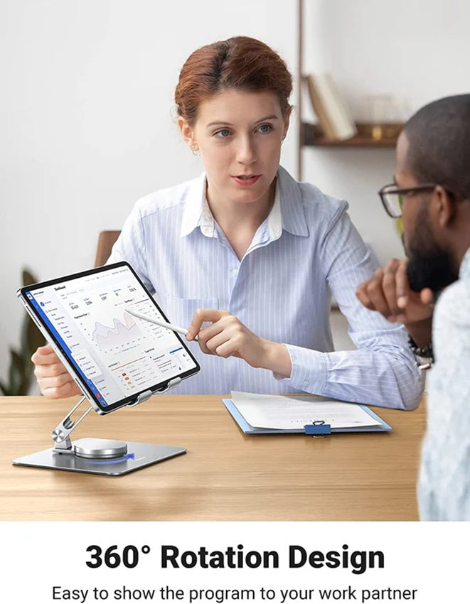 - Giro de 360 Grados y Función de Bloqueo: Con un eje de giro de 360 grados en la base, el soporte para laptop de escritorio le da más flexibilidad para girar su laptop hacia cualquier lado. La base giratoria tiene una función de bloqueo para que pueda bloquear la base después de girar el ordenador, lo que evita la rotación no deseada. Permite compartir fácilmente la pantalla con los compañeros en las reuniones. Más comodidad y practicidad en el trabajo y el estudio.