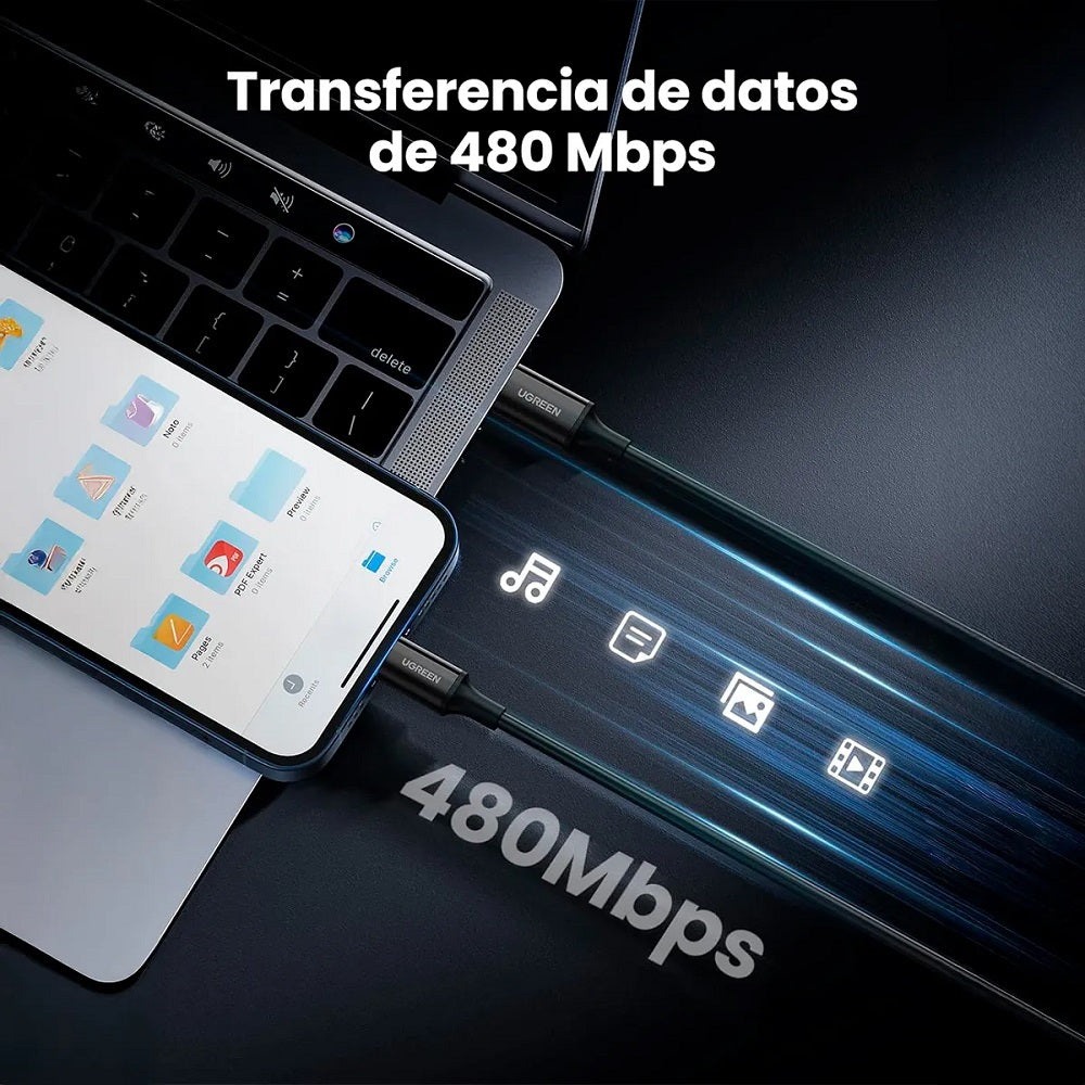 El Cable UGREEN USB-C a Lightning modelo 60751 cuenta con un conector Lightning C94 de alta durabilidad y certificación MFi, ofreciendo carga rápida por Power Delivery y transferencia de datos de hasta 480 Mbps. Diseñado para un uso seguro y confiable con dispositivos Apple.