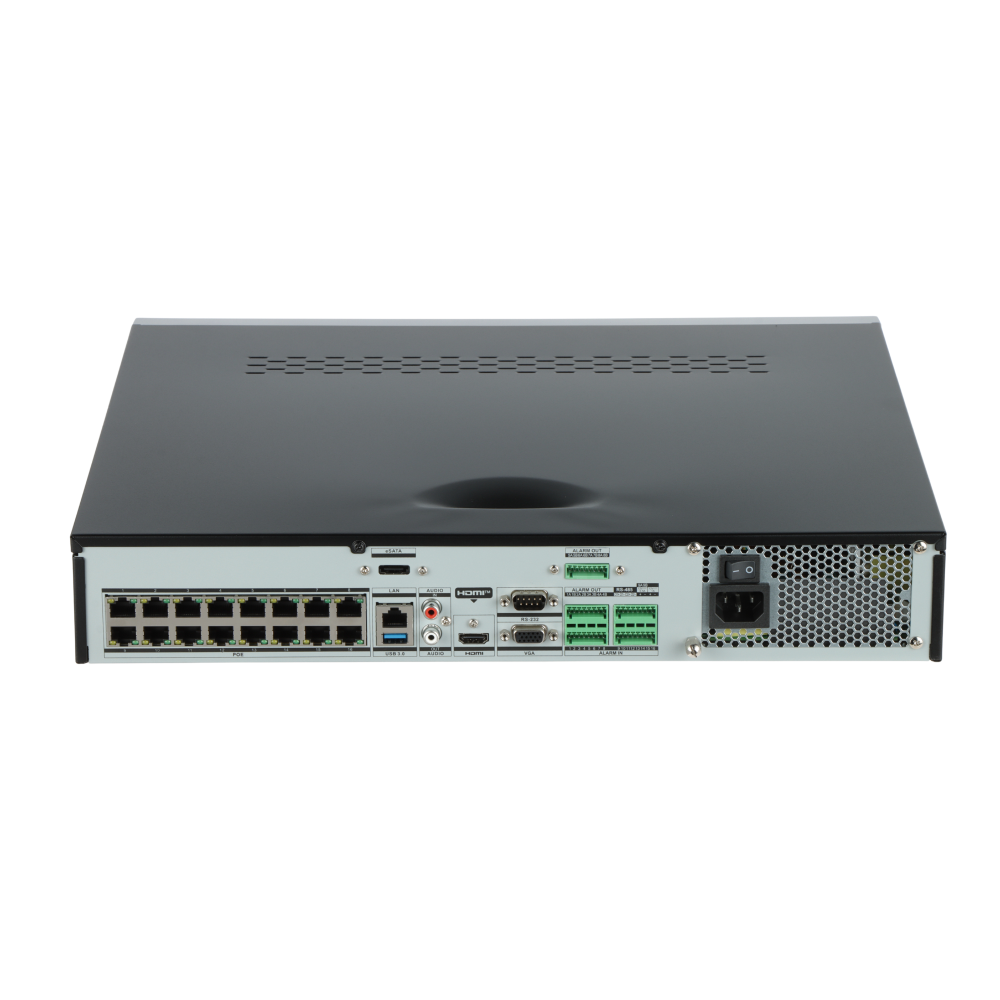 - Entradas de cámara IP de hasta 16 canales, plug & play con 16 interfaces de alimentación a través de Ethernet (PoE)