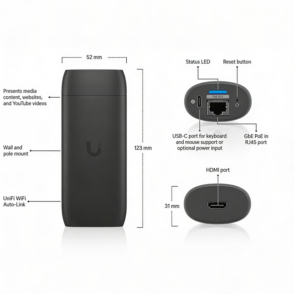 Reproductor de señalización digital administrado para pantallas HDMI con reproducción de contenido multimedia, modo web y compatibilidad con periféricos USB-C.