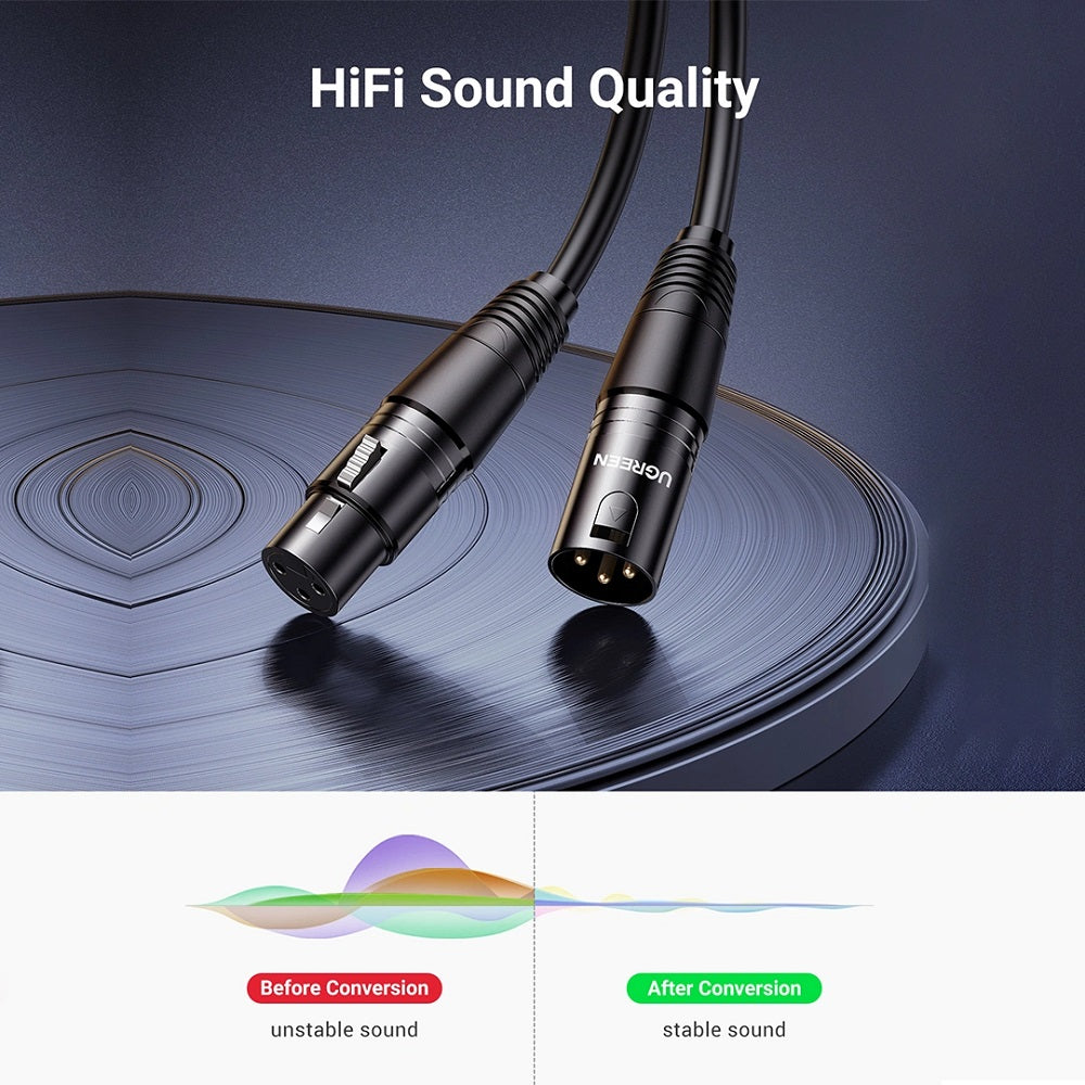 El Cable de Audio UGREEN AV130 XLR Canon macho a hembra está diseñado para ofrecer transmisión de audio balanceado clara y profesional en entornos exigentes.